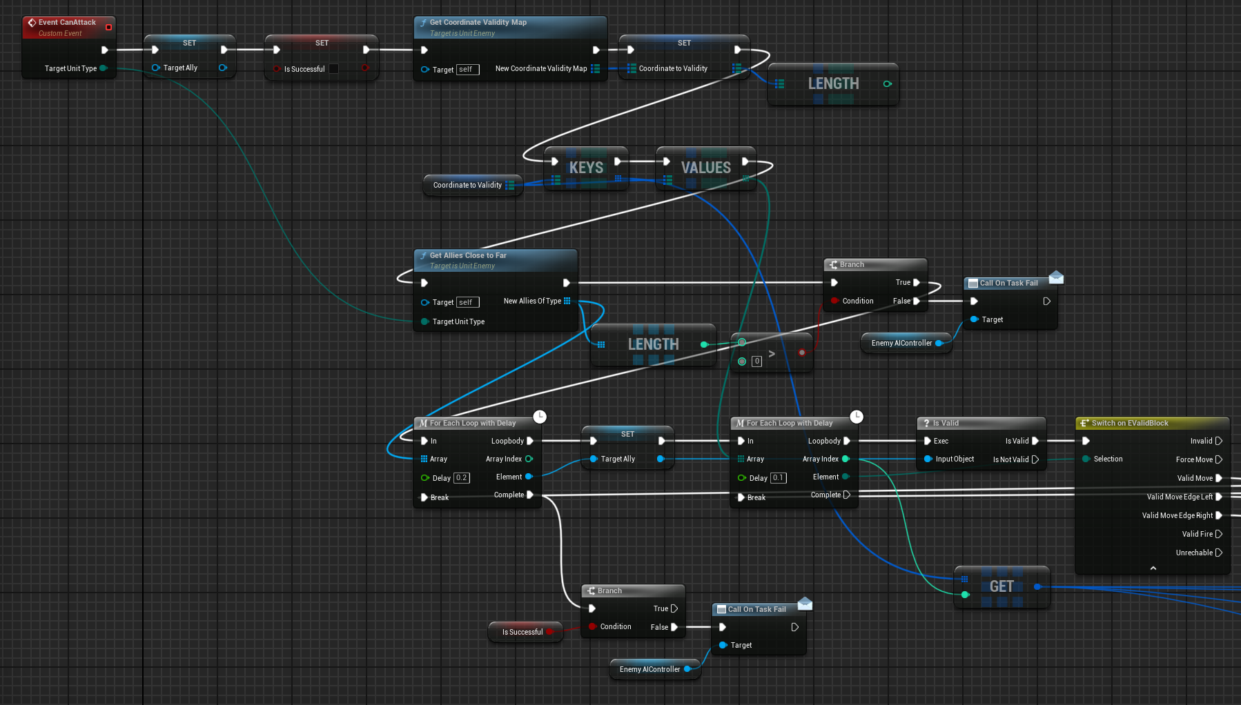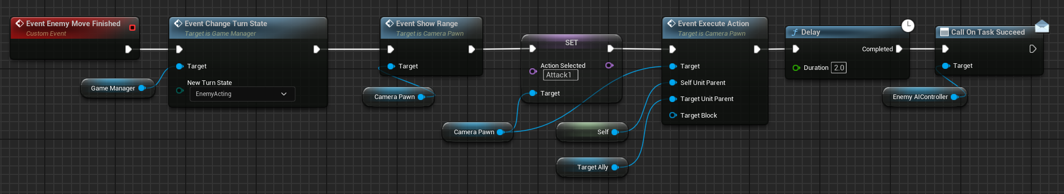 If IsValidFire() confirms that the target unit from the first loop is within attackable range, the enemy moves to the tile found in the second loop and attacks the target. To prevent other AI units from running prematurely or skipping logic during movement or attack animations, the system calls Event Enemy Move Finished after the movement. This ensures that the behavior tree task registers as succeeded.