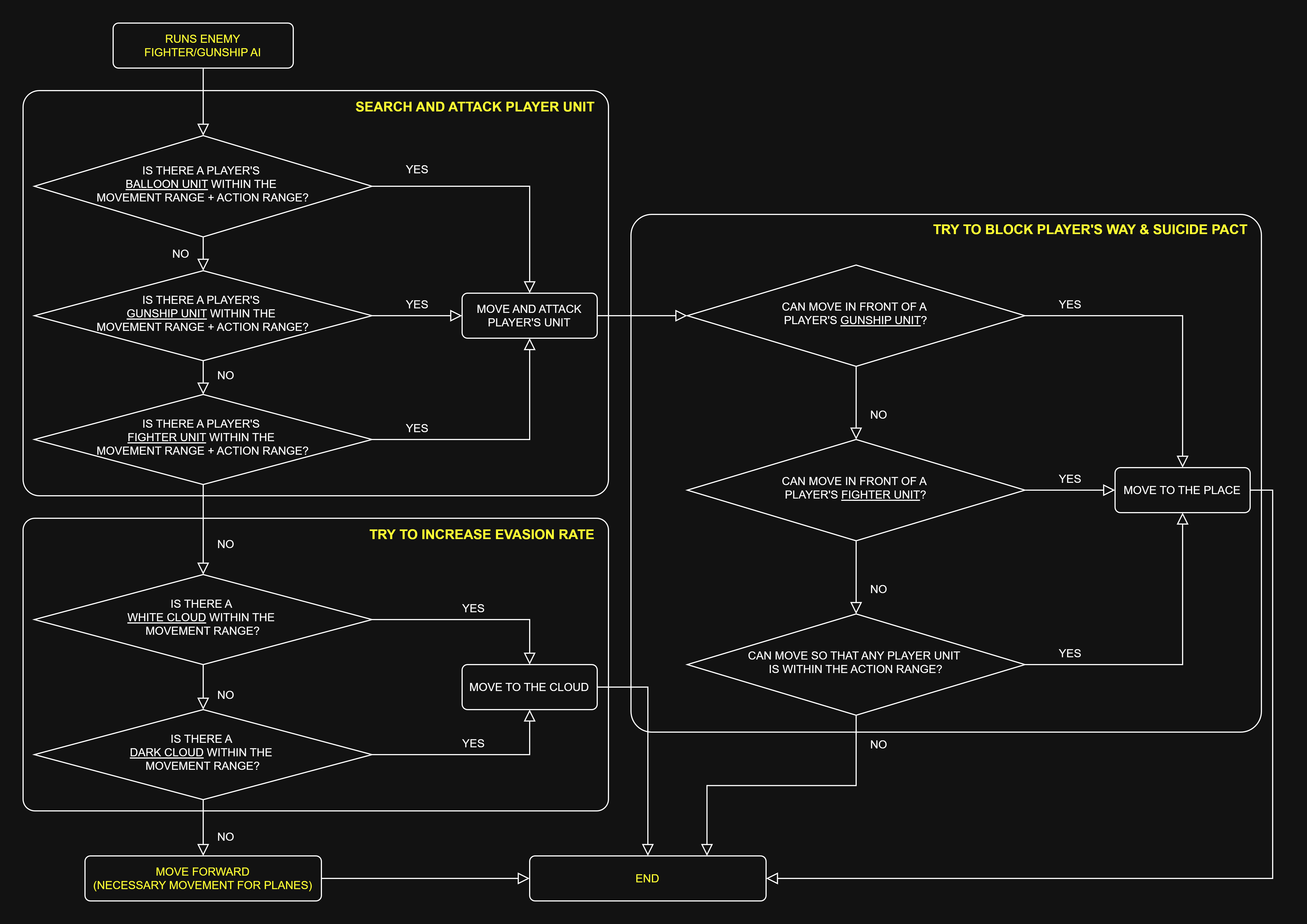 When the enemy AI finds a valid target, it attacks first and then checks whether it can move directly in front of the player’s gunship or fighter. This behavior takes advantage of the plane unit’s rule of being forced to move forward every turn, allowing the enemy to obstruct the player’s path or even tempt the player into a collision that destroys both units.