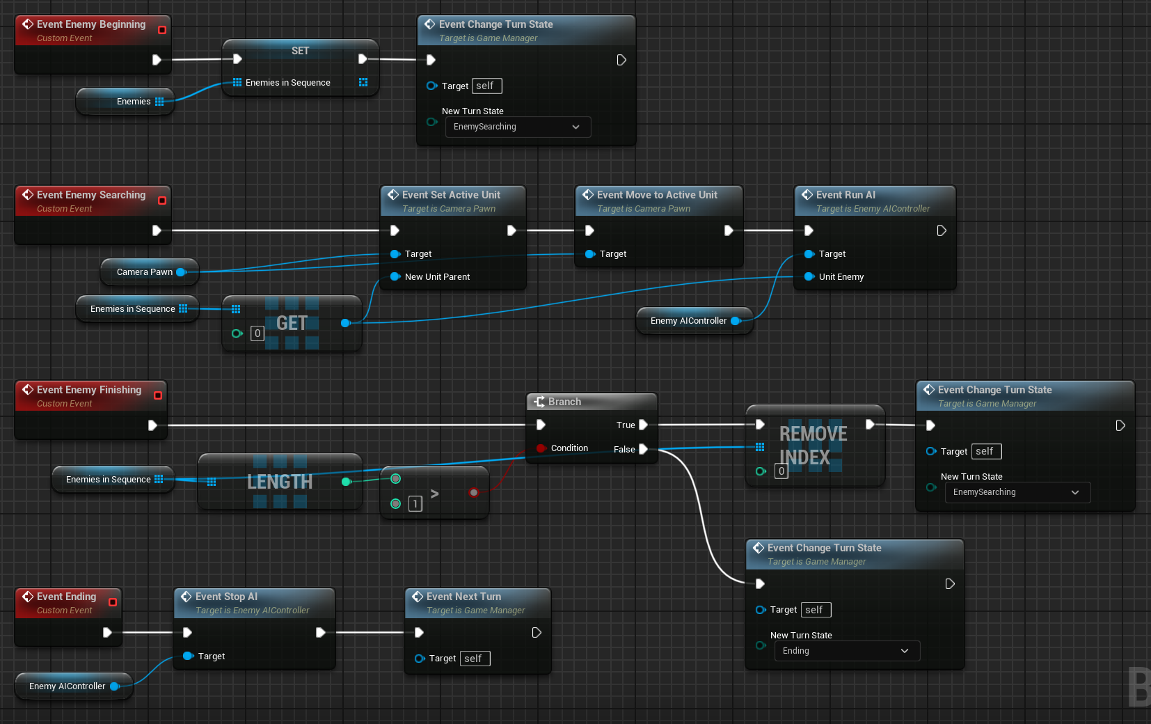 When the Event Enemy Beginning is called by the GameManager, a blueprint controlling the state machine, all current enemies are added to the Enemies in Sequence array. The first element of this array becomes the active unit, and the AI begins operating on that unit.