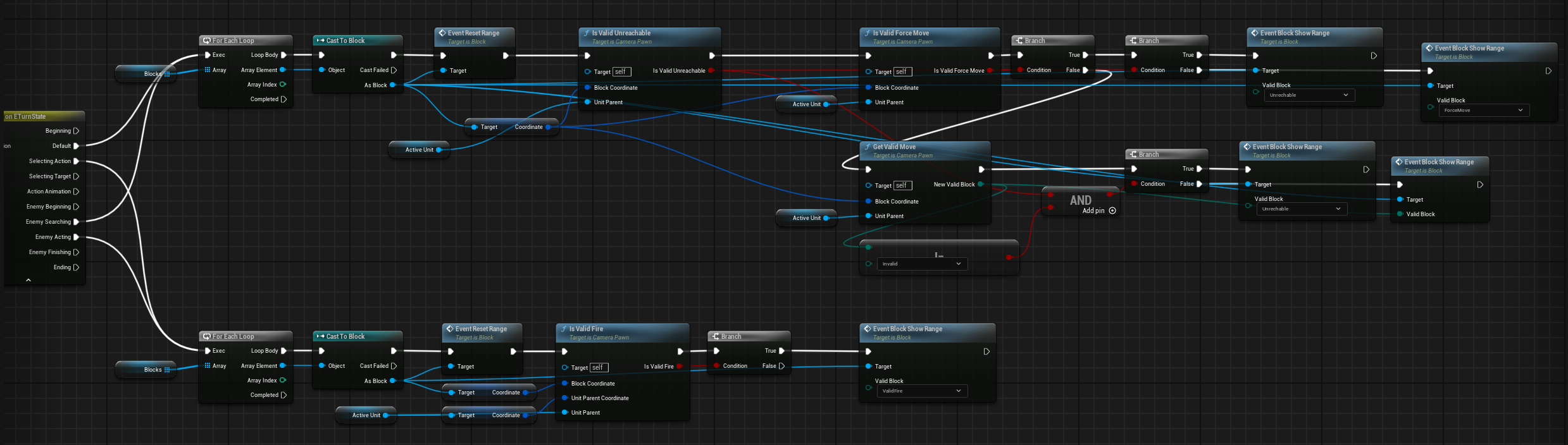 Because the simulation must consider the unit’s movement range, action range, direction, and coordinates all at once, implementing this logic required significant time. Specifically, restructuring everything into a clean, unified system took the most effort. To accomplish this, I refactored GetValidMove(), IsValidFire(), and the direction-setting event SetDirection so that both player units and enemy units could use the same shared logic.