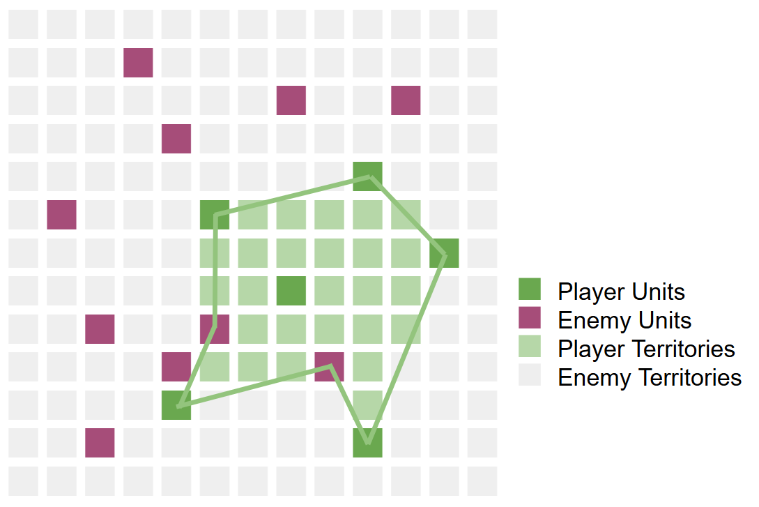 The goal of this game is to control a larger territory than the enemy once all turns have ended. The player’s territory is defined as the geometric plane formed by connecting the outer units. All remaining areas on the level are considered enemy territory. This unique winning condition that is rarely seen in other strategy games offers following advantages: