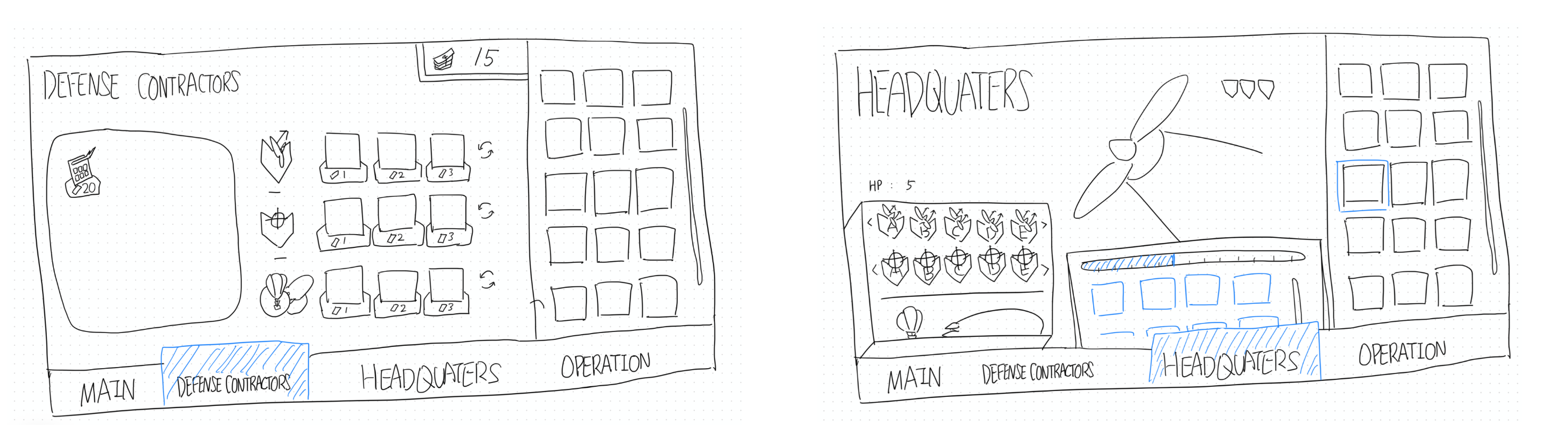 Before entering the battlefield, the player can visit the Defense Contractors to buy the actions and upgrades.