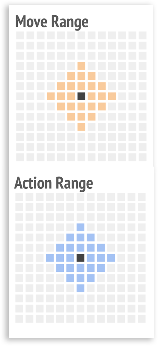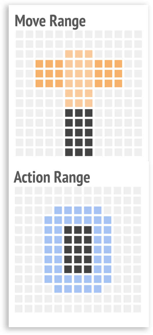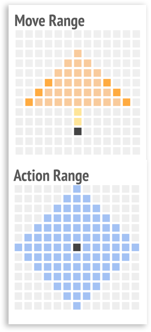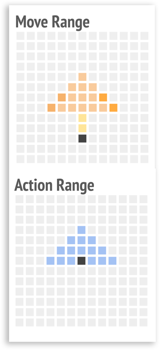 Since planes are unable to freely change direction, they become extremely vulnerable when their rear is exposed. To reflect this, airplane units can only change direction after moving to the edge of their movement range, and they cannot go backward. The interplay between each unit’s field of view, action range, and movement range encourages strategic decision. Like playing chess, units protect one another while probing the enemy’s formation for weak points to exploit.